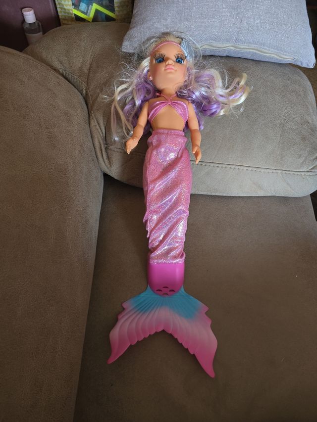 Product detailsPreciosa muñeca sirena con pelo largo y ondulado en tonos rubios y morados. Su traje de baño es rosa brillante y la cola de sirena es de color rosa y azul.