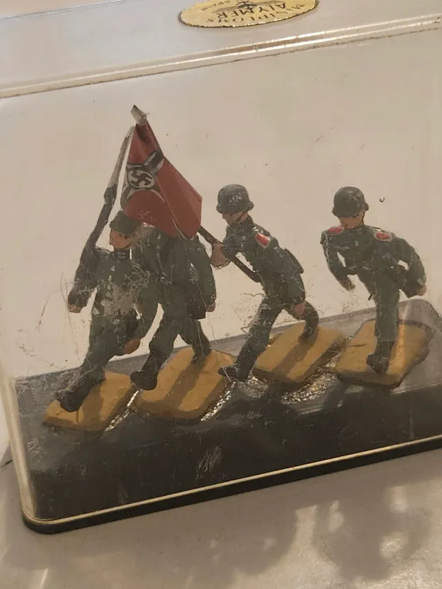 Set di soldatini in piombo vintage della marca Alymer. - Modello da collezione. - Raffigurano una scena di marcia con bandiera.