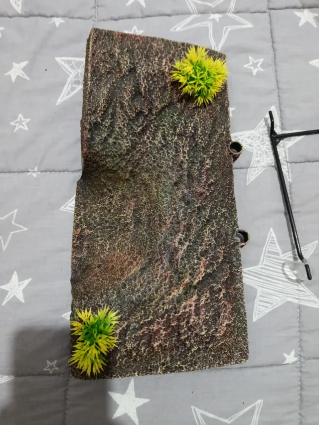 Superficie decorativa para acuario o terrario, ideal para tortugas. - Diseño rocoso con textura. - Incluye dos plantas artificiales de color verde brillante.