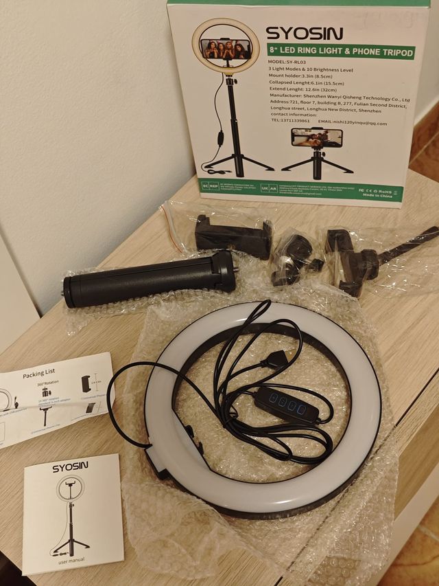 Product detailsRing light SYOSIN de 8 polegadas com tripé ajustável e suporte para telemóvel. Possui 3 modos de luz e 10 níveis de brilho.