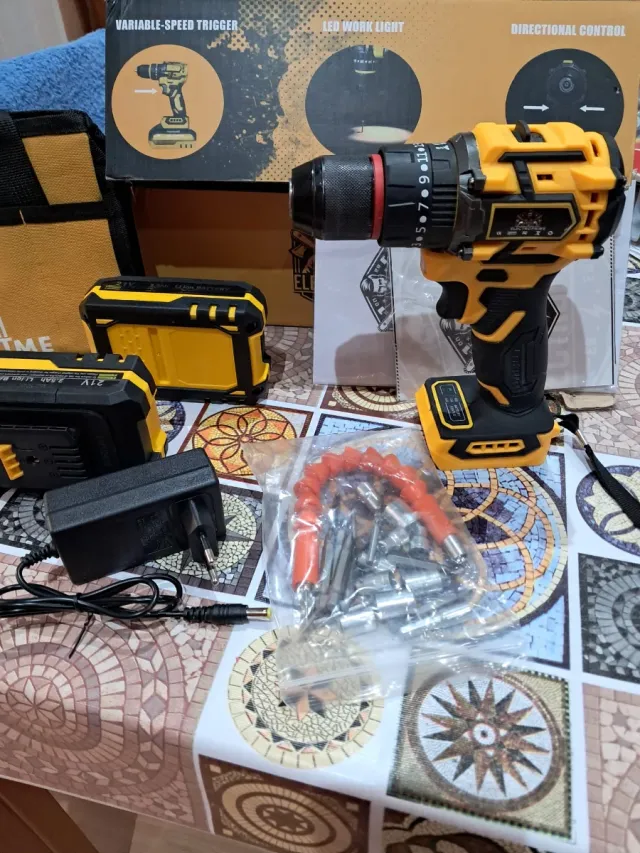 Product detailsTaladro atornillador percutor inalámbrico de 21V, ideal para trabajos en el hogar o profesionales. Incluye 2 baterías ,cargador, accesorios bolsa de trasporte.
