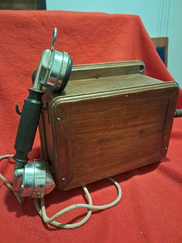 Teléfono antiguo con caja de madera, y teléfono de metal - Auricular metálico con mango de baquelita. - Cable de tela trenzada.