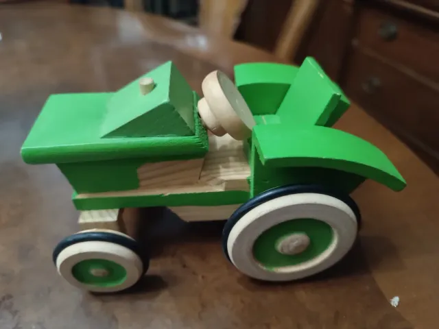 Bonito tractor de juguete hecho de madera. - Pintura de color verde. - Detalles en madera natural.