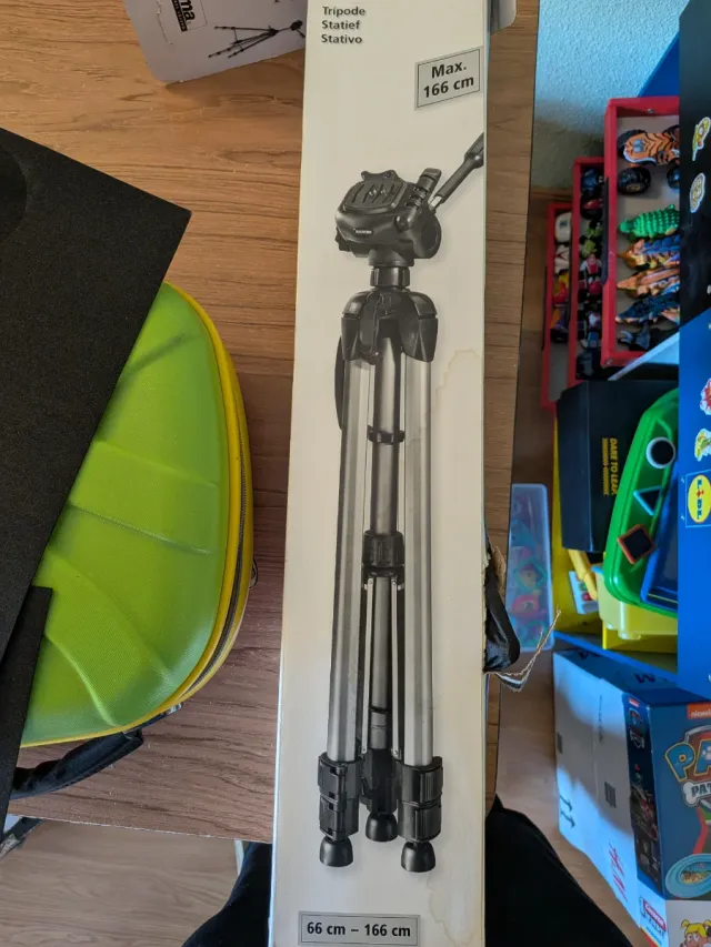 Trípode para cámara fotográfica o de vídeo. - Altura ajustable de 66 cm a 166 cm. - Cabezal con movimiento. - Patas estables.