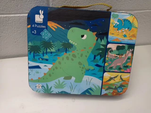 Product detailsValigetta in latta con 4 puzzle a tema dinosauri, marca Janod.