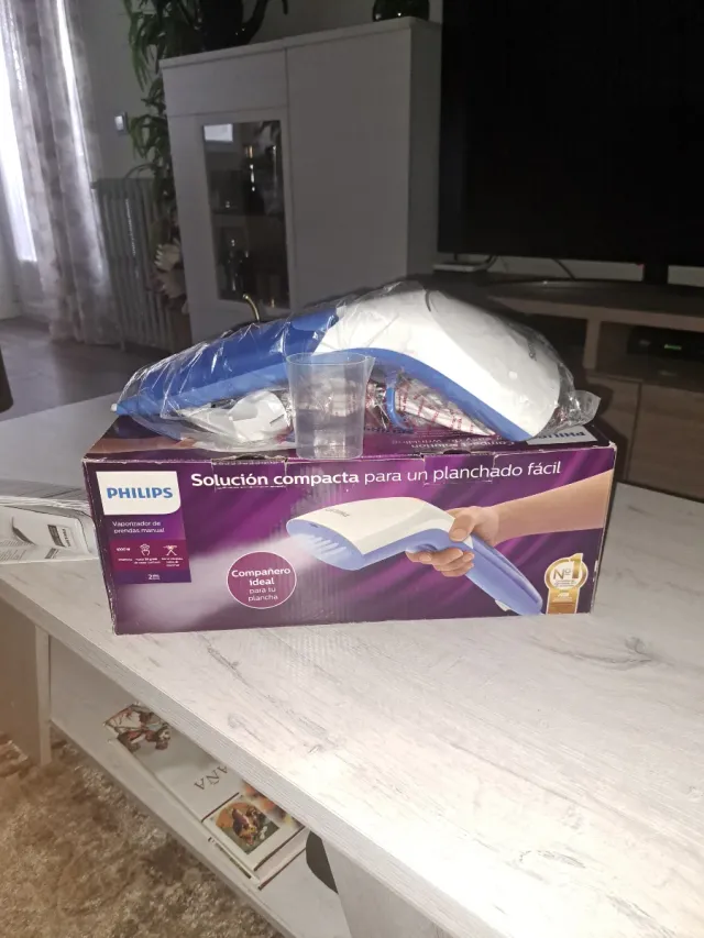 Product detailsSIN ESTRENAR: Vaporizador de prendas manual de Philips, compacto y fácil de usar. 1000W de potencia, hasta 20g/min de vapor continuo. No necesita tabla de planchar para ser utilizado.