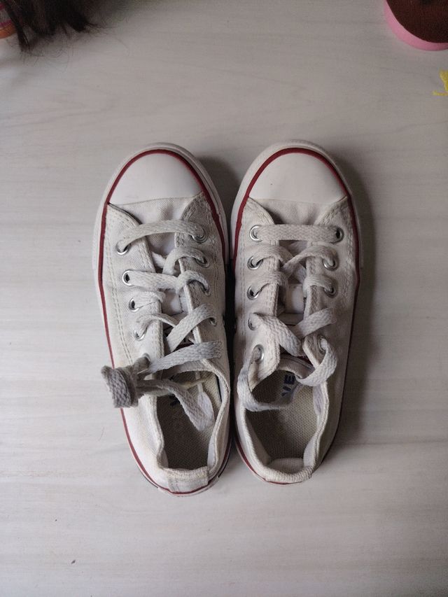 Zapatillas infantiles de la marca Converse en color blanco. - Cierre con cordones. - Detalle de línea roja en la suela.