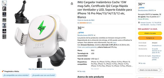 Cargador inalámbrico Coche 15W Certificado Qi2